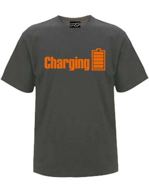 Batteries are full and we’re charging. A charging and battery logo printed on the front of this classic black t-shirt. It comes with a glow in the dark rushn logo on the back.