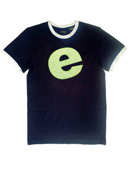 We decided to print a Super large glow in the dark e on the front, That’s just how we roll. The shirt is made from a heavy weight 190GSM Men’s Ringer T-Shirt